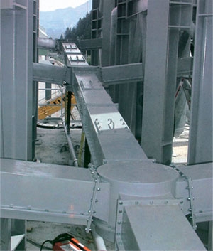 斜槽主要構(gòu)件是透氣層,本系列設(shè)計中采用的柔性厚型板式合成纖維織物,是一種新型透氣層,它具有耐高溫(可達150℃)耐腐蝕,耐磨損,吸濕性低,重量輕,表面平整,使用壽命長等優(yōu)點。透氣層無需現(xiàn)場安裝,每節(jié)槽體由制造廠組裝后,現(xiàn)場對接起來即可,這樣既減少了安裝工作量,又保證了質(zhì)量。